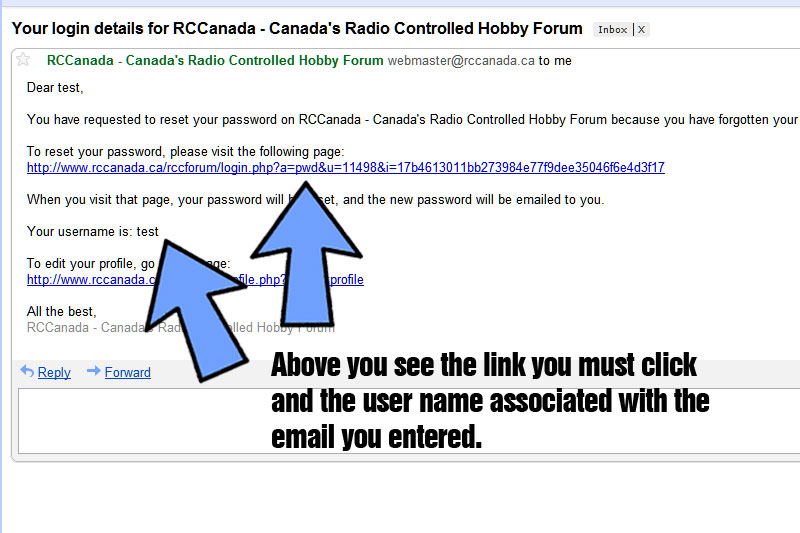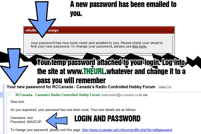 The email will provide you with your login and new temp password. Change the password once you are in your USERCP of the site.