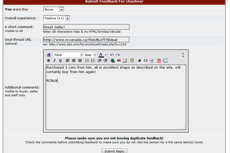 An eBay style feedback system may be installed on the site. This is the general idea on how to use it IF it is up and running. If it is, the images provided below will give you an idea on how to leave feedback after a transaction.