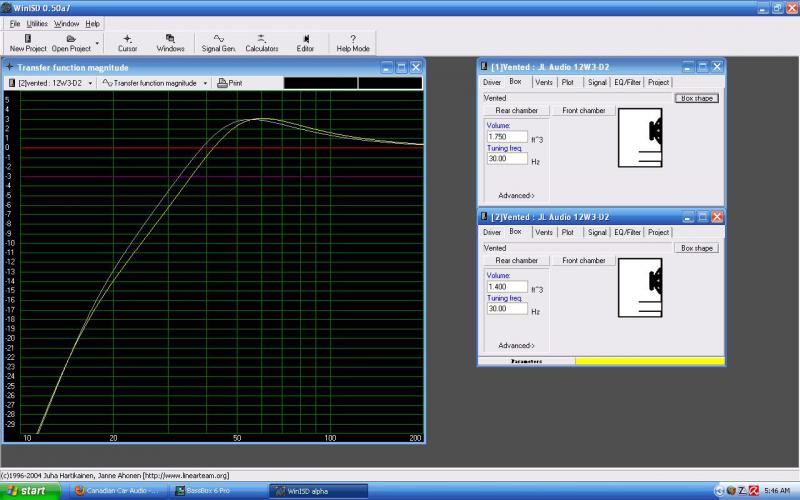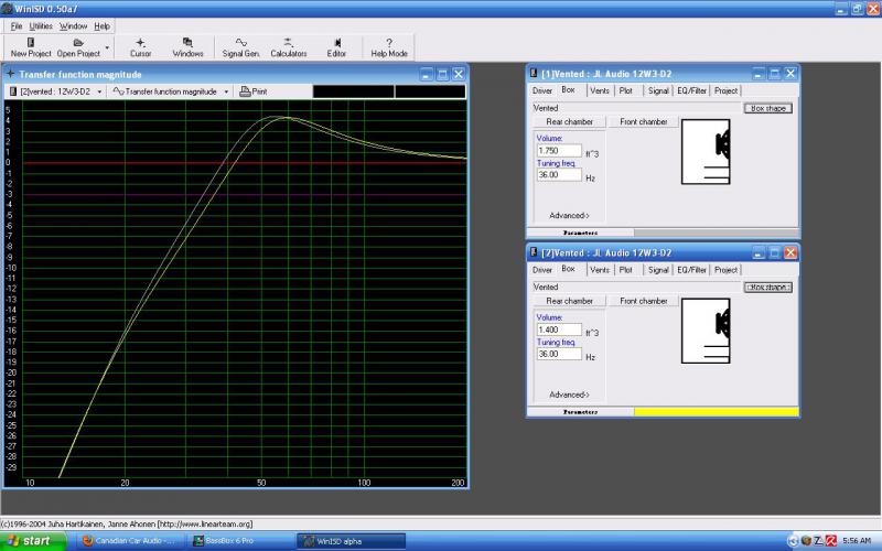 hmmm.... looks like the color isn't showing in the picture for some reason. It's there on my copy... anyhow, the lines on the right are yellow. Lines on the left are JL specs. Also notice that the box tuned to 36hz is about 1.5 db louder than the one tuned to 30hz.
