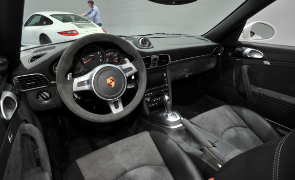 With white paint, black wheels, red brakes and that trademark Porsche 911 bubble-butt body, this 911 GTS is terribly sexy and hardcore. Same deal inside. Drivers get plenty of gauges, a big centre mounted tachometer, and a simple, concise and focused control layout.