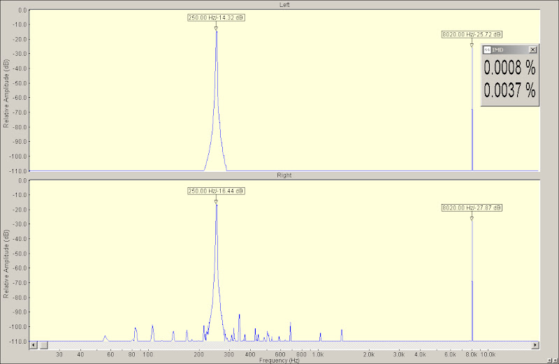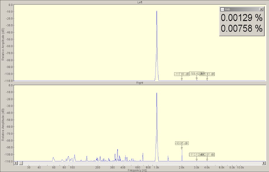 Here is a distortion graph from a test I did today. The upper (left channel) plot is the loopback and is the limit of my test setup. I use an Azus Zonar sound card which has a very low published SNR spec. The lower plot is the MiniDSP performance. The window to the top right gives THD respectively.