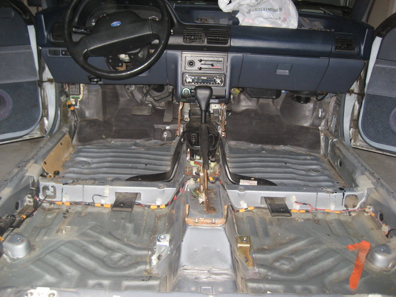 Got some work done tonight. Ran all the wires and got the sub baffle in and mounted. Probably will put the carpet back in tomorrow and connect the amp and crossover. Had the first application of the fleck stone paint tonight too
