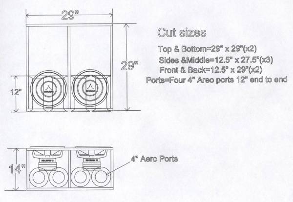 the traditional crx box has the woffers fireing up and the ports towards the rear of the vehicle,it measures 29 x 29 x 15" and uses 4" areo ports 12" long. its a proven fact that areo ports will have a dbl gain over regular round ports.