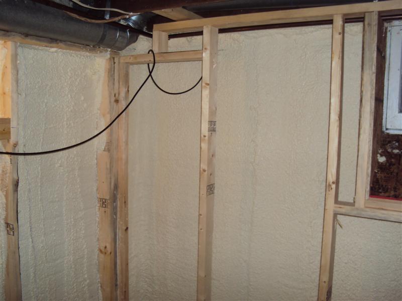 Here is a shot of the spray foam. Not much to look at, but it does what I need it to. The foam is great, because its applied to the wall and Roxul can be applied on top of it. This will help a great deal in the future. I sprayed an inch and a half of the Tiger Foam and will apply R14 batt on top of that. This will yeild about R24.5. Enough for me to get full credit on the energy audit Im having done on my home. The rear wall (with the window) will be R69.5. This is the main bass trap wall. The ceiling was also spray foamed with a thin lay to help seal the room.