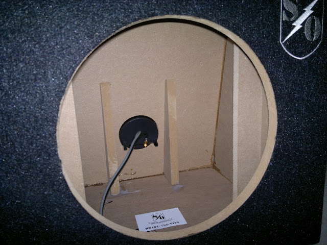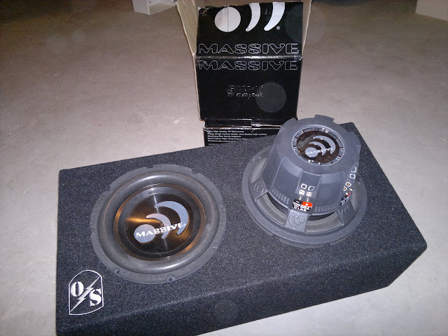 HEre are some pics of the subs going in. Yup some more massive audio. These are a no longer in production line, not sure why I got these (guess because they were cheeper in price hehe), hopefully I end up happy with them. I do like some screw terminals on them making them easy to wire, unfortunetly they have some hex tops so they don't continu the tradition with their amps of star top screws.
