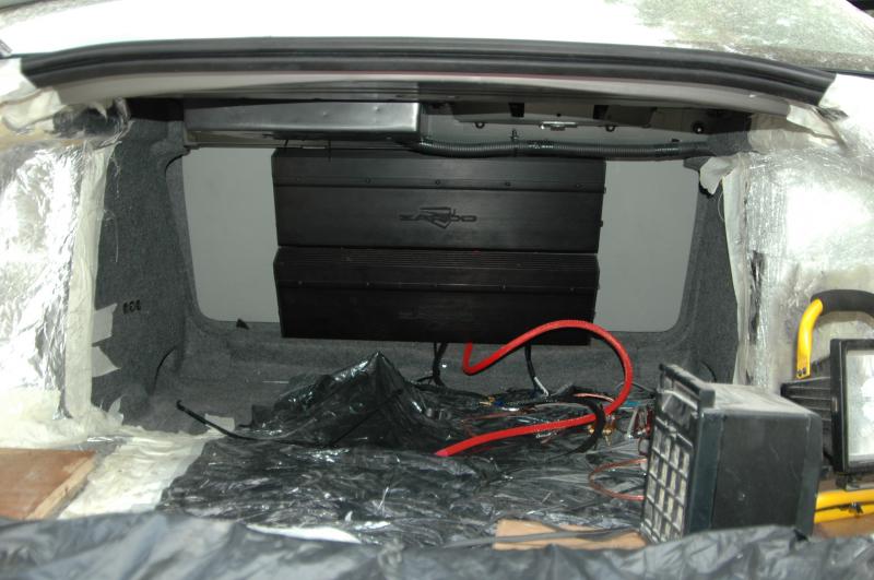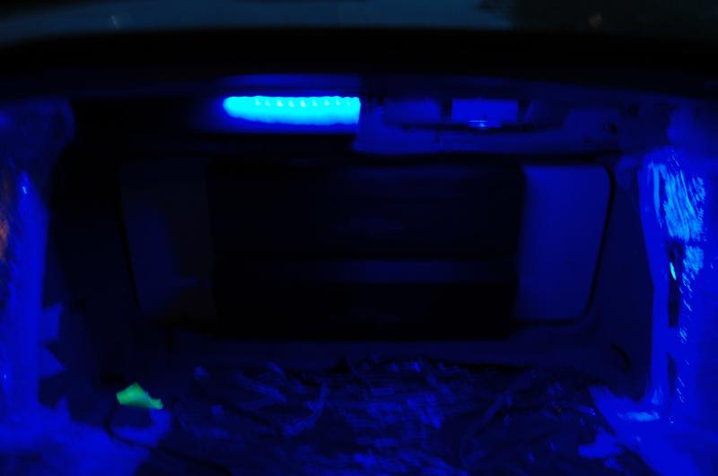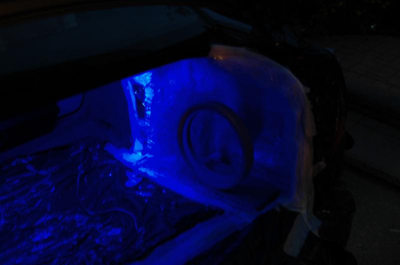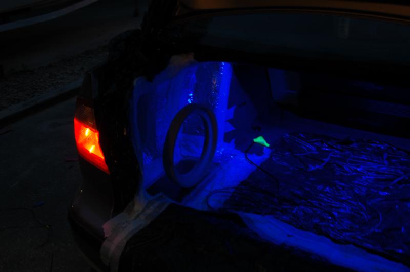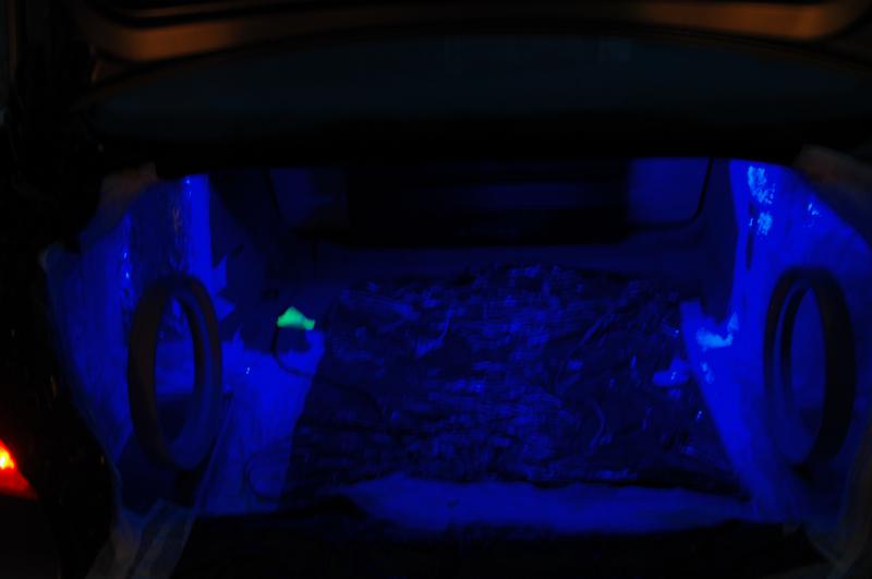 Yesterday and today's progress. Amp rack lit up with blue LED's switches on/off with trunk opening. 1-1/2" MDF rings cut and counter sank. and more boring fiber glassing.