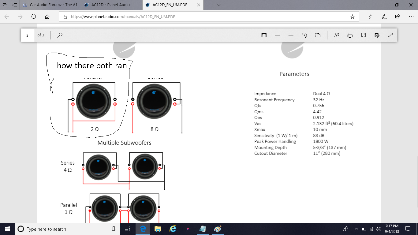 ran in parallel down to 2 ohm each the sub is ran neg to neg then to amp and pos to pos and ran to amp both subs are ran th